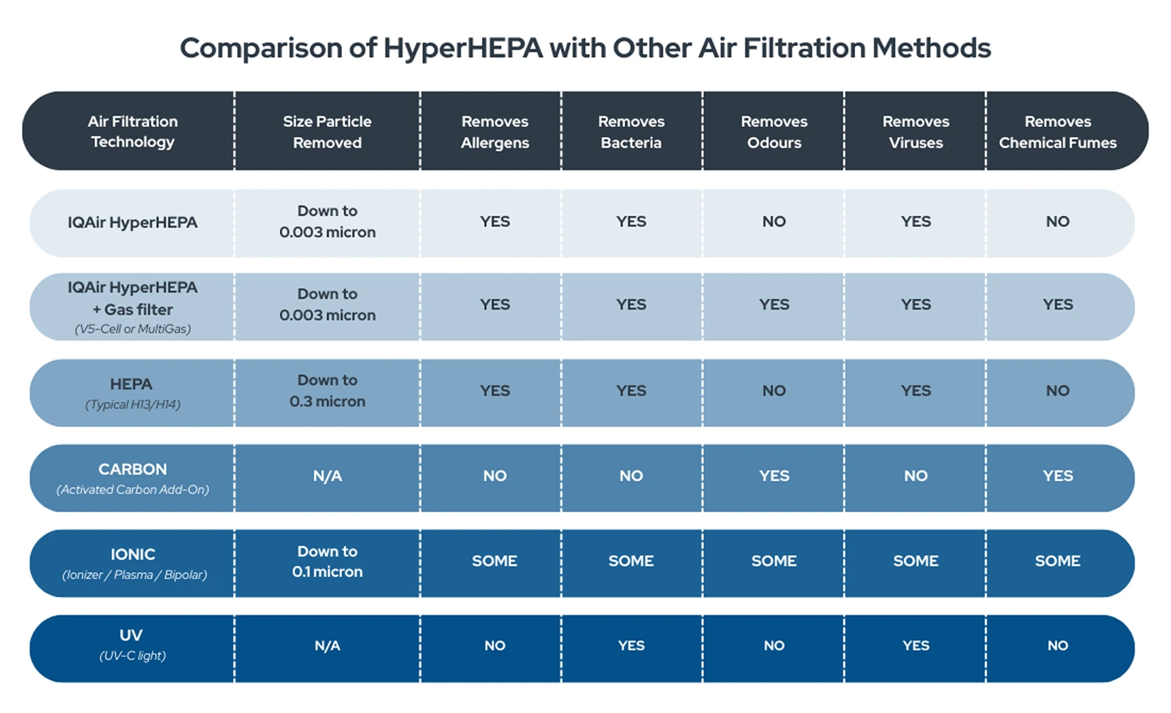 IQAir’s HyperHEPA is built to go beyond what “standard HEPA” is certified for. HEPA (High-Efficiency Particulate Air) filtration is widely used and typically certified to capture 99.97% of particles down to 0.3 microns. HyperHEPA takes filtration further with innovative filter media made of ultrafine, electrostatically charged fibres that attract and trap ultrafine particles down to 0.003 microns, helping remove even the smallest and most harmful pollutants, providing unparalleled air quality for users.