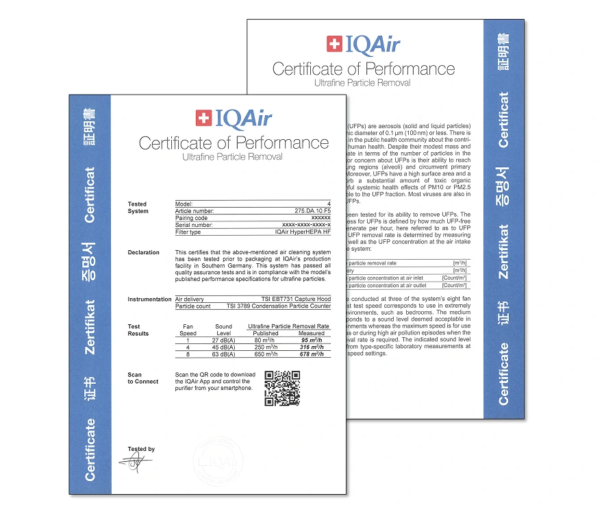 Made at IQAir’s own Swiss and German production facilities, IQAir’s high-performance air purifiers are built to last. Each unit undergoes individual testing and certification, ensuring the highest performance standards. When you choose IQAir, you’re choosing proven Swiss quality trusted by families and medical professionals for over six decades.