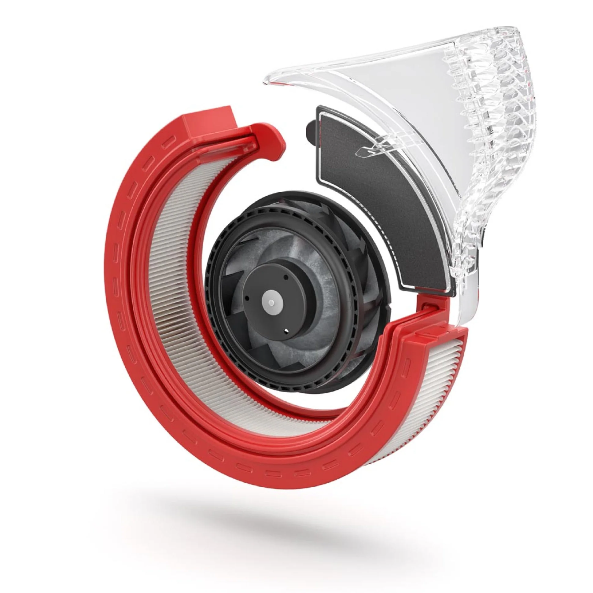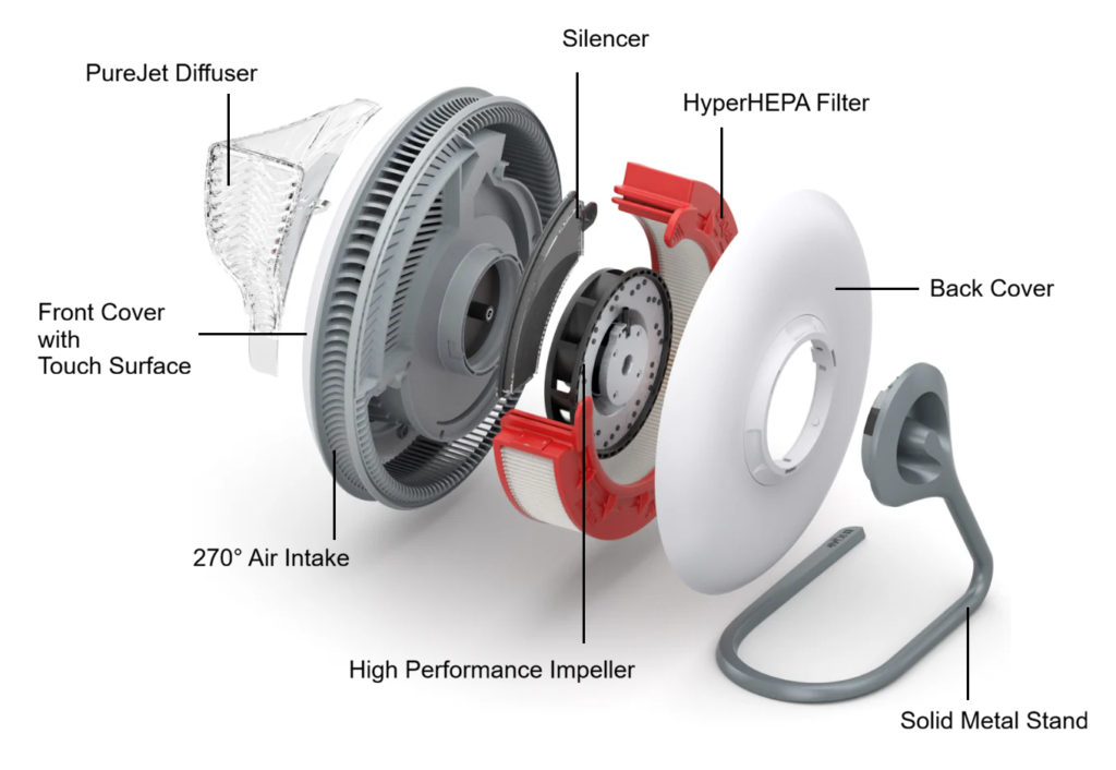 The Atem Desk uses a wrap-around filter design that surrounds the fan by about 270 degrees. This allows the purifier to pull in polluted air from multiple directions instead of a single intake point.