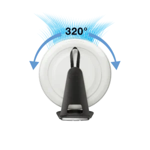 This is made possible by Flexible Air Rotation (FAR) technology. The Atem X is suspended from a sturdy aluminium stand, allowing for a free 320° rotation around its central pivot point. This enables effortless single-handed adjustment of the clean air stream to accommodate the room’s shape and the positioning of the air purifier. Tip: On a hot summer day, you can even direct the air stream to a specific part of the room for a refreshing cool breeze.