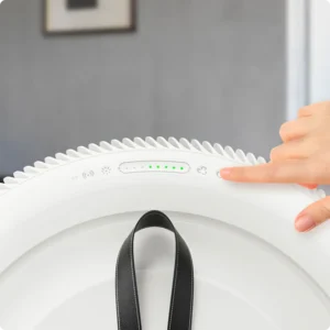 It incorporates advanced air quality sensors that continuously monitor the environment for fine dust particles (PM2.5), CO2, temperature, and humidity levels. These sensors enable the Atem X to adjust its fan speed dynamically and the level of purification needed. An innovative feature, the AQGlow air quality indicator, emits a soft glow behind the unit to visually communicate the current air quality, with this feedback directly informed by the air purifier’s internal sensors.
